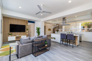 Enjoy a bright open-concept space featuring a fully equipped kitchen with white quartz countertops, stainless steel appliances, and a sleek glass cooktop. The central island doubles as a perfect bar for happy hour cocktails. 🍸🍳