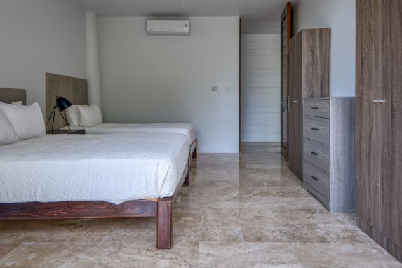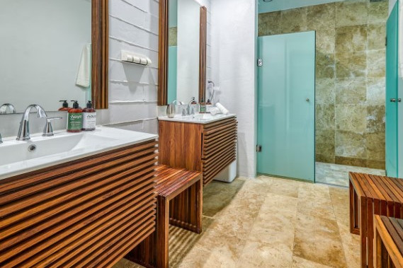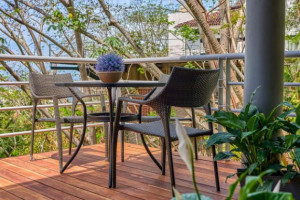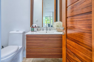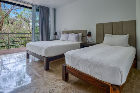 On the first level, there are three bedrooms with separate entrances: one with an ensuite bathroom and two that share a bathroom. All bedrooms have a balcony with chairs and a table, a safe, a hairdryer, air conditioning, a ceiling fan, and a closet. The villa also offers a fully equipped modern kitchen, laundry area, living room with TV and comfortable sofas, high-speed Wi-Fi, and a beautiful green area next to the pool. Guests have full access to the two swimming pools, the house, the front and back patios, the walking trails within the community, and the sun terrace, ensuring a comfortable, private stay with a connection to nature.