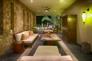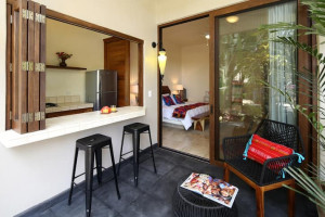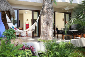 Guests share access to the lush tropical grounds and a large saltwater pool surrounded by serene lounging areas.
