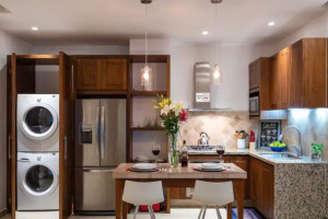 This well-appointed studio offers a fully equipped kitchen with granite countertops, a washer & dryer, a full bathroom with marble sink and rain shower, a king-size bed, a comfy sofa, and a flat-screen TV. Step out onto your private balcony overlooking peaceful gardens and partial city views—perfect for your morning coffee or an evening glass of wine.
