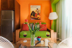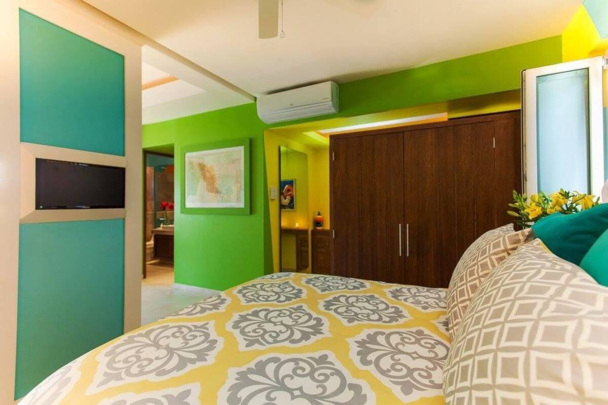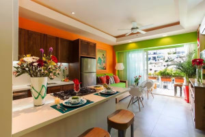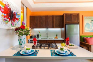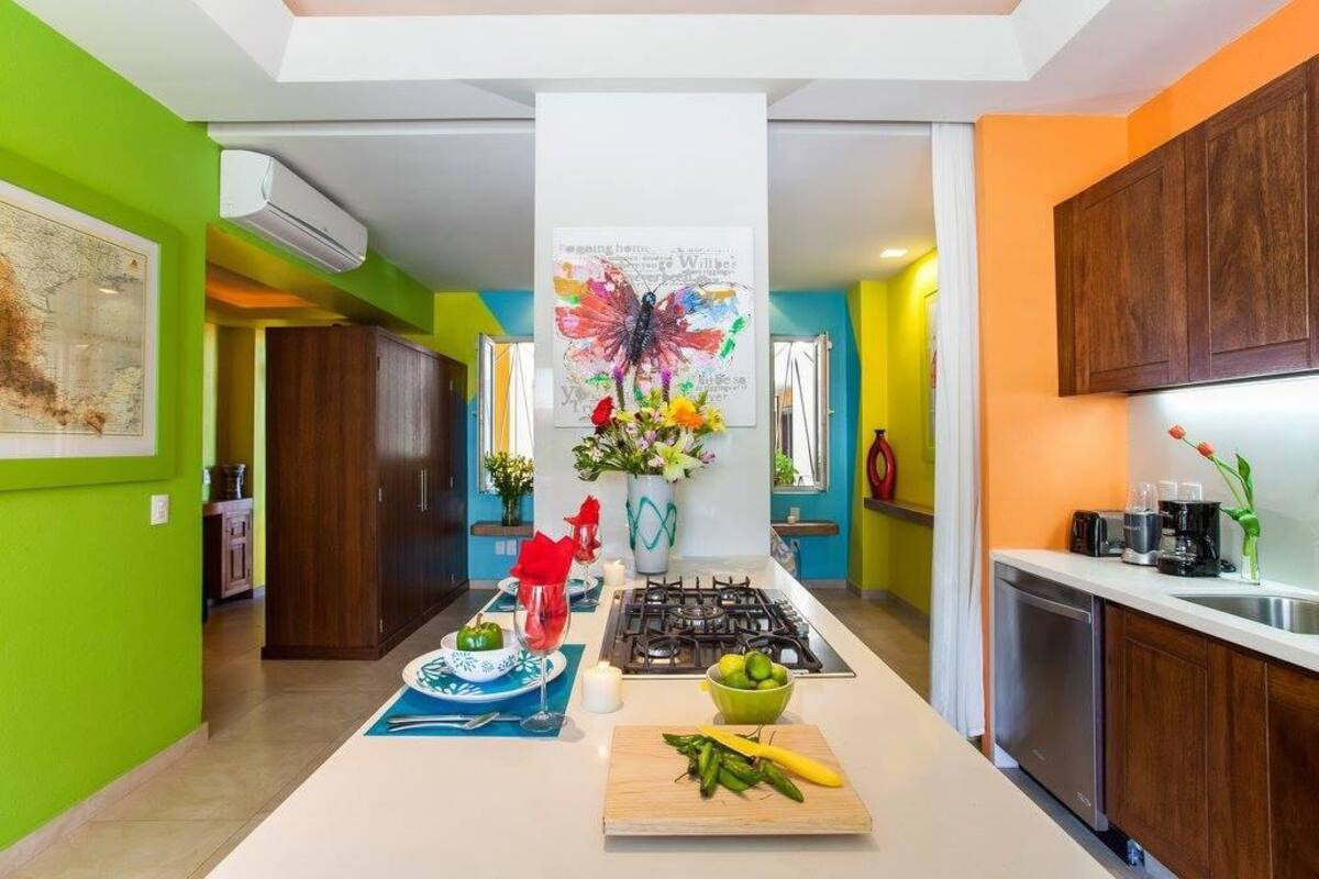 Experience luxury and comfort in this one-of-a-kind, upgraded 700+ sq. ft. Elite studio just steps from Los Muertos Beach. Thoughtfully designed with custom finishes throughout, this spacious unit blends style and functionality.The unique kitchen features full-size, high-end appliances — refrigerator, dishwasher, oven, gas stove, and microwave — perfect for longer stays or those who love to cook. A striking 10-ft Caesarstone feature wall divides the kitchen and bedroom, extending to recessed ceilings and adding a touch of modern elegance.